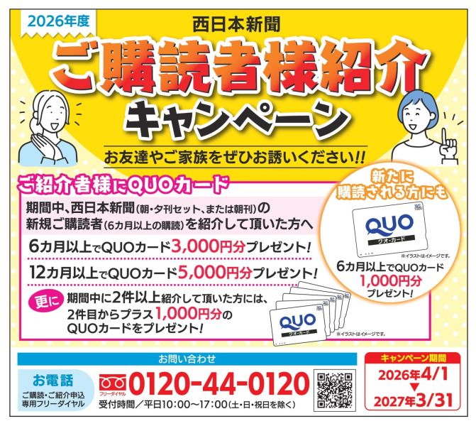 - 新規ご購読者様は、西日本新聞を直近6ヶ月以内に購読しておらず、購読の予約をされていない方に限ります。