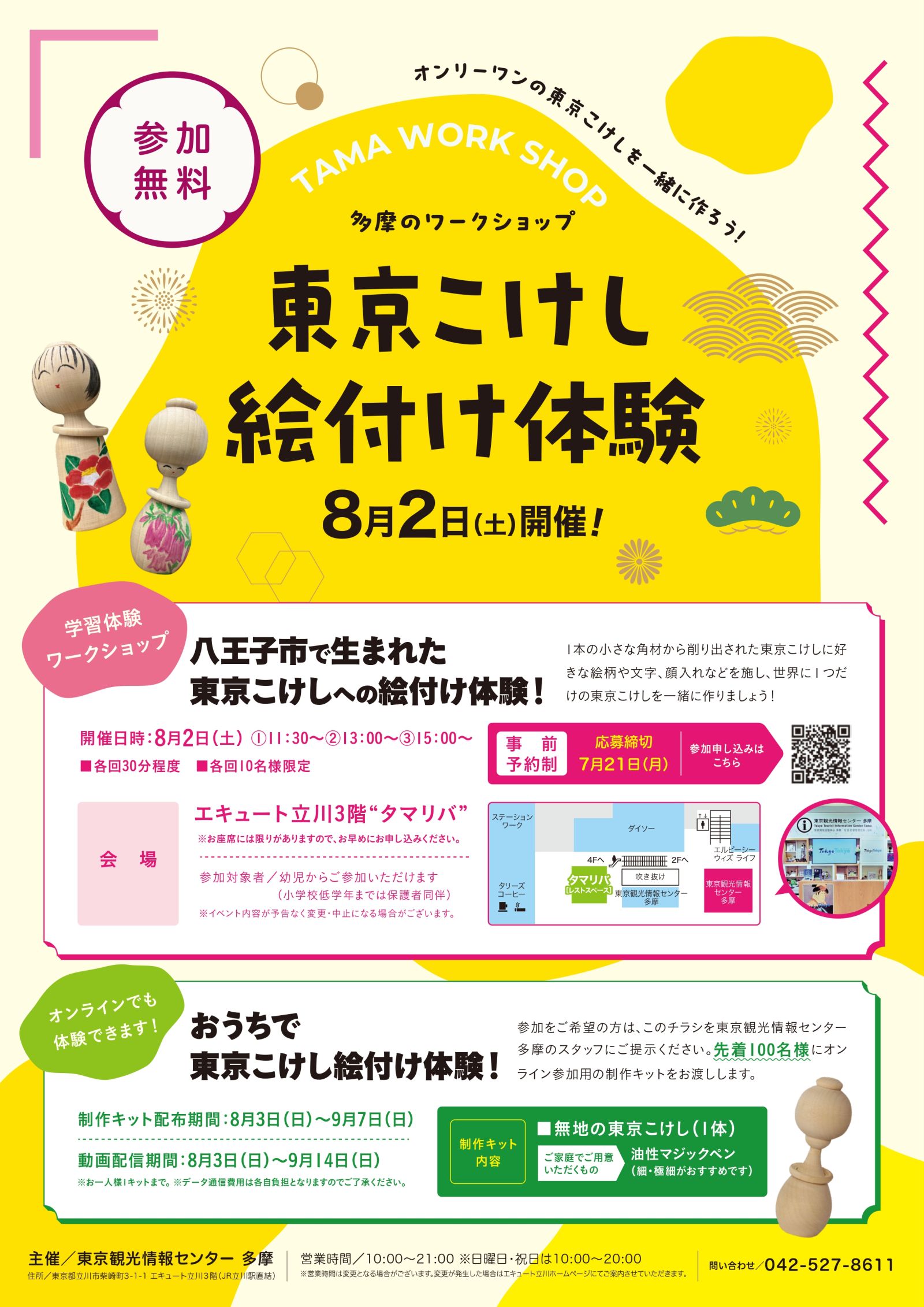【東京観光情報センター 多摩】学習体験ワークショップ 東京こけし絵付け体験! 八王子市で生まれた東京こけしへの絵付け体験! 1本の小さな角材から削り出された東京こけしに好きな絵柄や文字、顔入れなどを施し、 世界に1つだけの東京こけしを一緒に作りましょう!