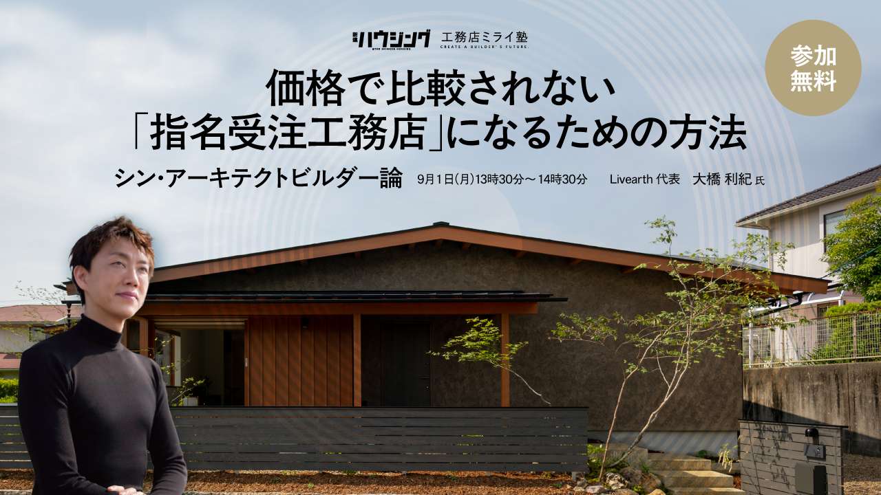 シン・アーキテクトビルダー論・アーカイブ[期間限定・10月9日(木)まで] 主催:新建新聞社 新建ハウジング 「設計の力」が経営にもたらす価値と、地域で長く信頼され続ける工務店になるための本質について 試行錯誤を重ね、自身の体験価値を積み上げてきた大橋さんだからこそ語れる、地域で持続的に信頼される「指名受注工務店」になるための方法を、本セミナーで特別にお話しいただきます。 9月1日(月)に開催されたシン・アーキテクトビルダー論のアーカイブを大公開! <内容> ・大橋氏が語る“今、工務店が設計で生き残る方法” ・実際の塾の中身を垣間見られる「特別な60分」 ・本塾でしか得られない、実践ノウハウの一部を先行公開 <講師> livearth(リヴアース) 代表取締役社長 大橋 利紀 氏 ★お申込み方法★ (1)申込フォームに入力 (2)【申し込む】ボタンをクリック (3)お申込み後の自動返信メールにて視聴URLのご案内をさせていただきます ※受付締切:10月5日(日)17時00分 まで ■シン・アーキテクトビルダー塾 10月開催! 本塾の詳細はコチラから:https://www.s-housing.jp/archives/386505 【お問い合わせ】(受付時間 平日9時~16時30分) 新建新聞社 新建ハウジング TEL:026-234-2215(0120-47-4341) メール:mirai@shinkenpress.co.jp