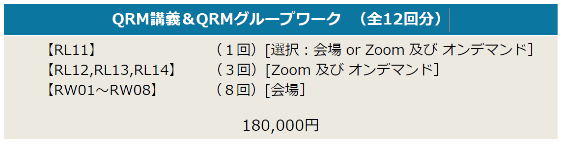 | 料金 | 【全講座(12回分)申し込み】 QRM講義&QRMグループワーク (全12回分)180,000円 |
