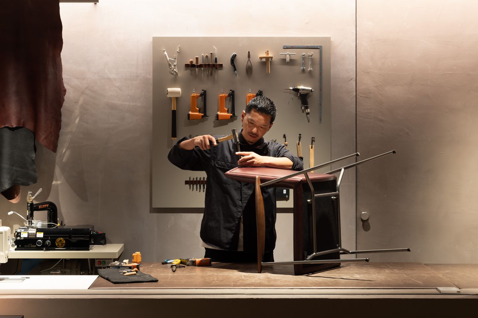 2025年7月30日に発売した今年の新商品「VESPER lounge chair 」。バックレストは背の緊張感をそっとほぐして柔らかく身体を包み、シート部分は三次曲線の形状で座り心地をほどよく安定させます。フレームはやや細めのスティール製を使用して軽快感を保ち、手のひらに直接触れるグリップ部分は厚革を編み込み温かな安心感を与えます。職人の手仕事による繊細なディテールが美しい一脚です。今回の実演では、主に、厚革をフレームに編み込む作業を行います。(VESPER以外の商品の実演も予定しています)