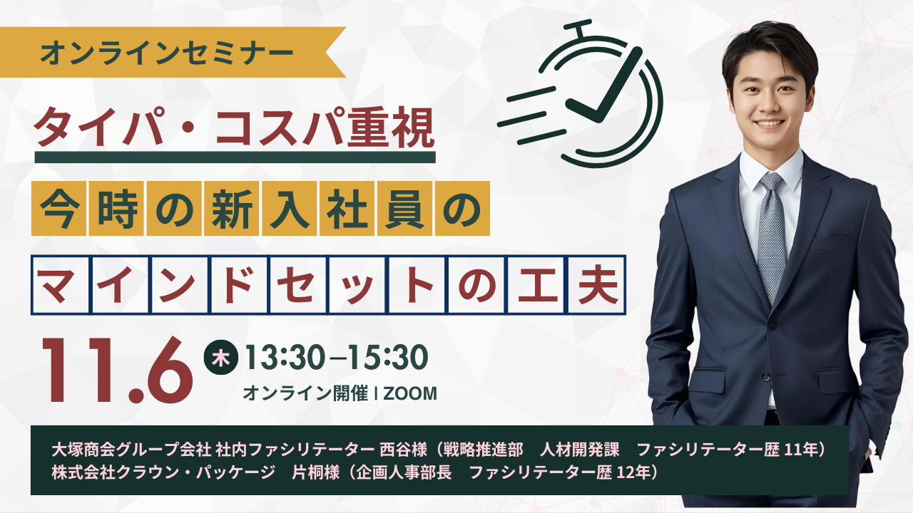 10年以上、当社とお取引のある各企業で社内ファシリテーターとしてご活躍のご担当者様より、今どきの新入社員に対して、一見タイムパフォーマンスが良さそうな「スキル」ではなく、あえて時間を要する「マインド」強化になぜ取り組んでいるのか、お話しいただきます。