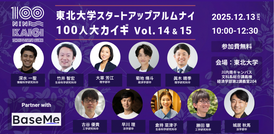 同日午前中、同会場内にて「東北大学スタートアップアルムナイ100人大カイギ Vol.14&15」が開催されます!東北大ビジコンとは別にお申込みが必要となります。