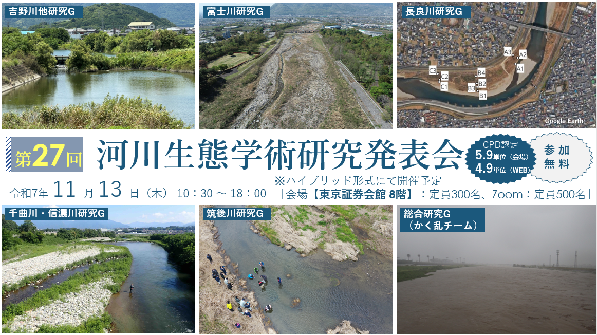 この度、河川生態学術研究会では、「第27回河川生態学術研究発表会(11/13(木)開催)」を会場とZOOMウェビナー併用のハイブリッド形式で開催します(応用生態工学会共催)。