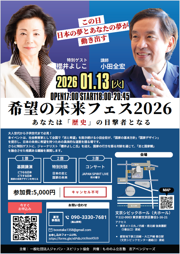 本イベントは、社会教育家として全国で「志と希望」を説き続ける小田全宏が、「国家の基本方針」「国家デザイン」 を提示し、日本の未来に希望を持つための具体的な道筋を語る場です。