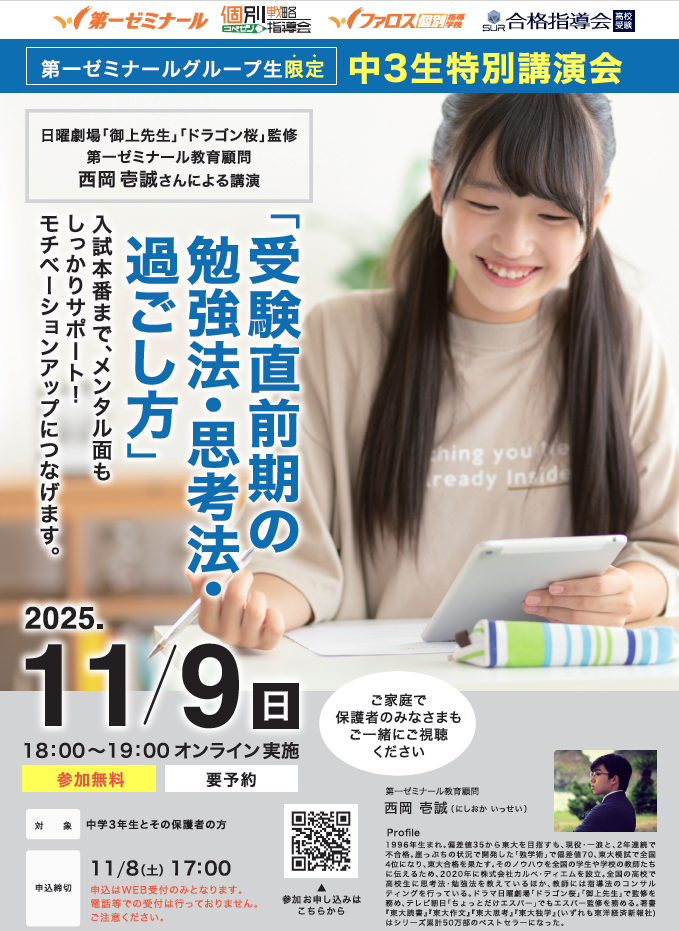 11/9(日)【中3生_特別講演会】受験直前期の勉強法・思考法・過ごし方