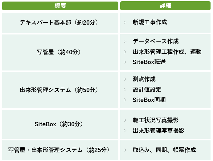 SiteBoxでの写真撮影・設定のポイントを解説するほか、写管屋・出来形管理システムの事前準備の方法や取込み方法、また電子小黒板エディターを使用した小黒板作成方法を解説します。すでに使用している方ももちろんですが、これから始める方でも学ぶことができる講習です。