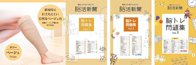 今回の脳活新聞コレクター プレゼントは「ふくらはぎ着圧サポーター(色ベージュ)」、「脳トレ問題集vol.1」、「脳トレ問題集vol.2」、「脳トレ問題集vol.3」です。
