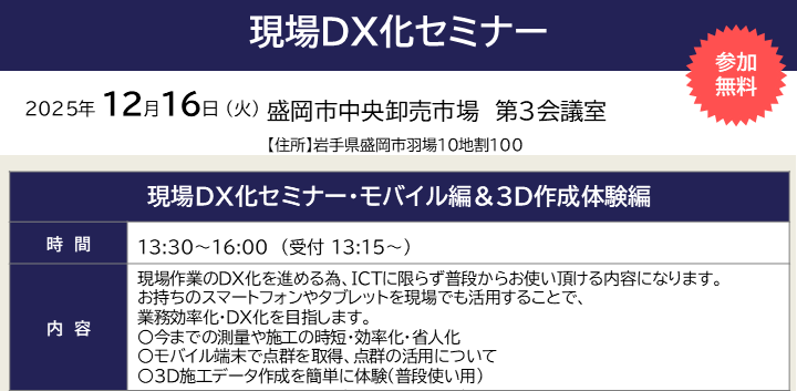 2025/12/16(火)【岩手県盛岡市】[午後の部]現場DX化セミナー・モバイル編&3D作成体験編