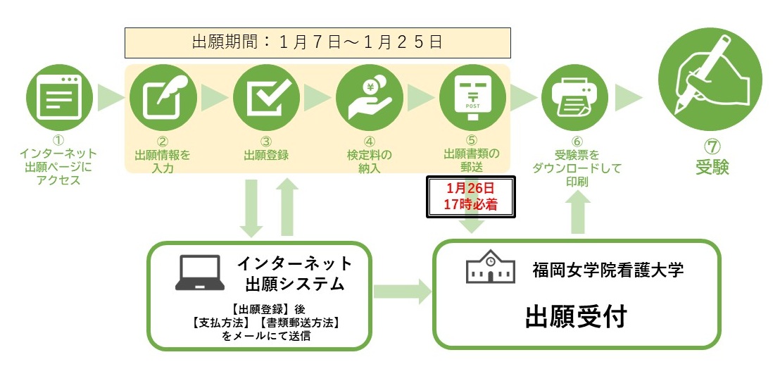 出願登録だけでは完了しません。必ず、入学検定料の納入と必要書類の郵送が必要です。