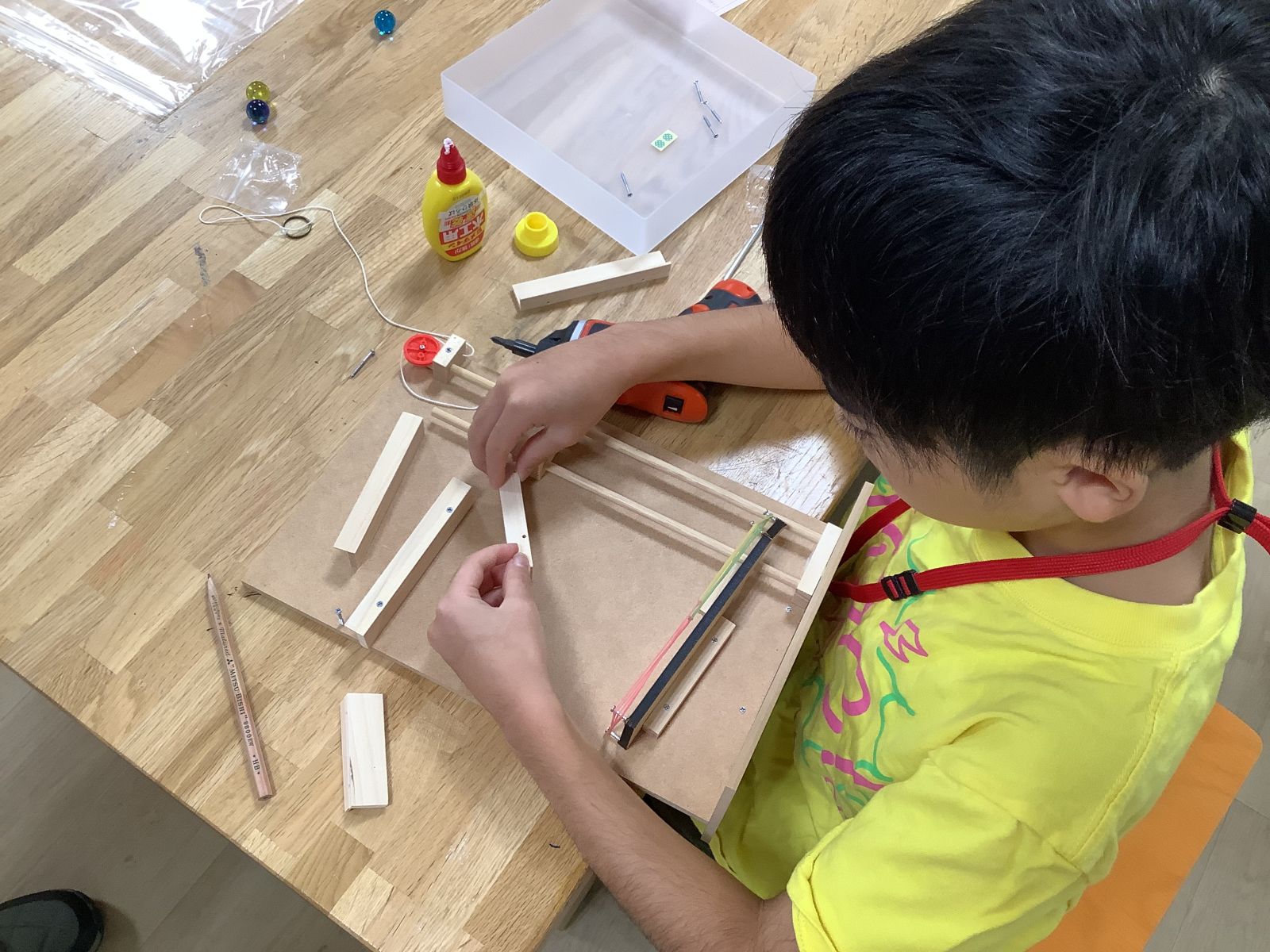 マーブルマシンビルダーの原田先生といっしょに、ビー玉が登っては転がってを繰り返す、『手動ビー玉エレベーター』を作ります。