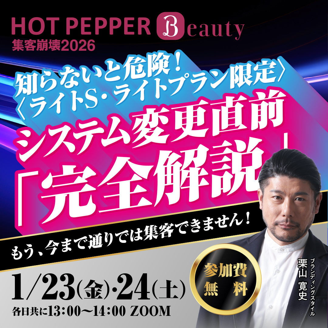 ホットペッパービューティー集客崩壊2026 知らないと危険!〈ライトS・ライトプラン限定〉2026年3月システム変更直前「完全解説」 開催日時 2026/1/23(金) 13:00 〜 14:00 カレンダーに追加 Google Mac (iOS) 2026/1/24(土) 13:00 〜 14:00 カレンダーに追加 Google Mac (iOS) 開催地 オンライン開催 申し込みフォーム 会社名(店舗名)必須 名前必須 ふりがな必須 電話番号 ※当日連絡のつく電話番号を入力ください メールアドレス必須 メールアドレス(確認用)必須 営業担当必須 「エステプロ・ラボ」商品は導入されていますか?必須 はい いいえ 当セミナーをどこで知りましたか?必須 メルマガ SNS(Facebook・Instagramなど) Pro Labo セミナーガイド(Webサイト) プロラボ公式LINE プロラボ担当営業からの案内 その他 定員を超過しています × 懇親会の定員を名超過しているため受付できません 定員を超過しています × 申し込み合計人数が定員から名超過しているため受付できません キャンセル待ち受付中 × 定数に達している為、「キャンセル待ち」にて申込ます。よろしいでしょうか? 内容の最終確認 × 申し込みフォーム