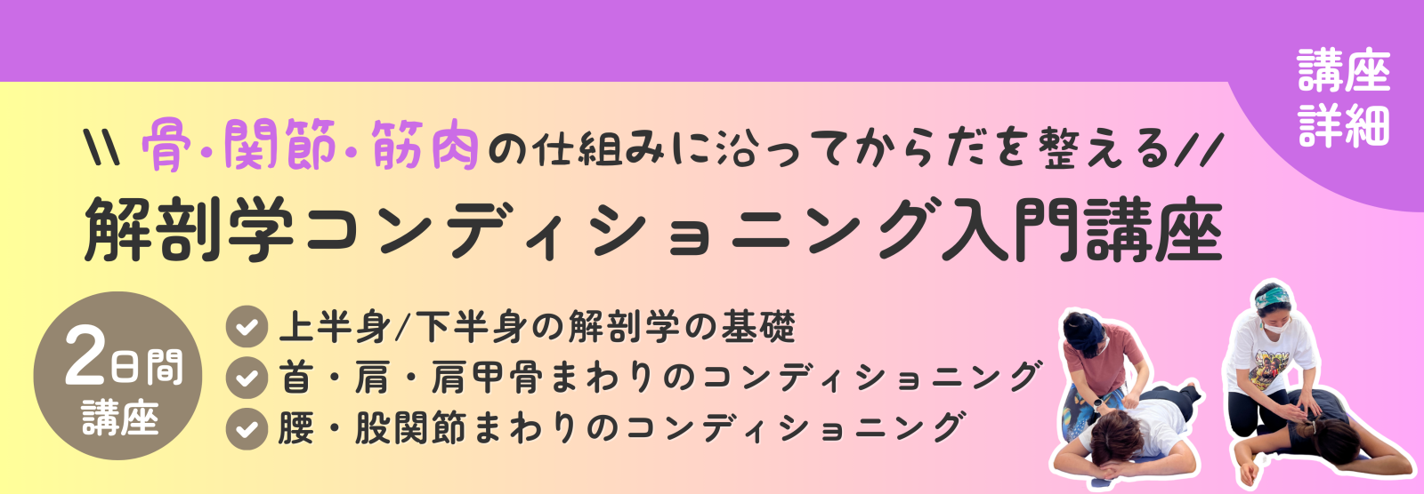 首から肩、肩甲骨まわり、そして腰から股関節にかけての不調を、『解剖学マップ』に沿ってコンディショニングしていく方法を、ペアワークを中心に学んでいきます。