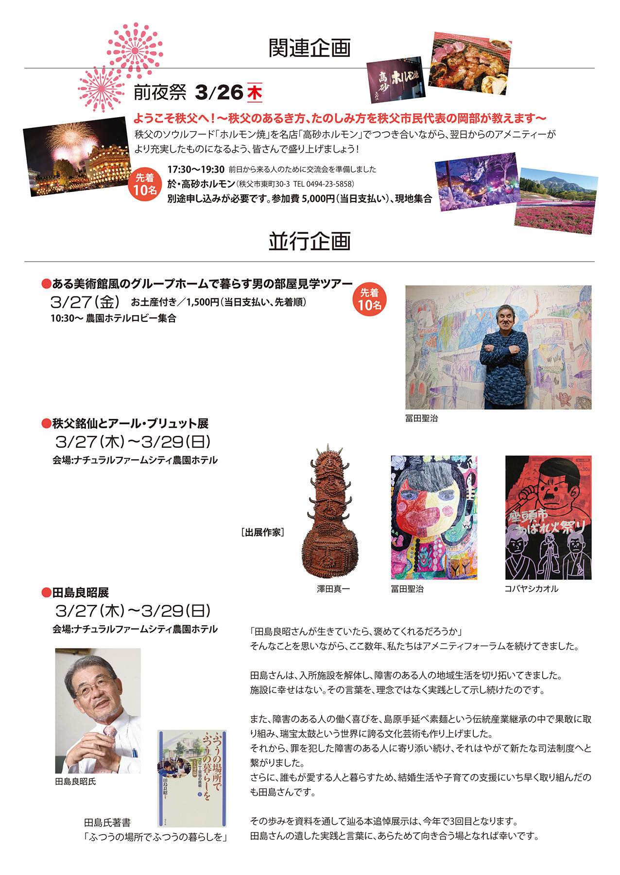 前夜祭 先着10名 3月26日(木)17:30~19:30 会場:高砂ホルモン(秩父市東町30-3、現地集合)