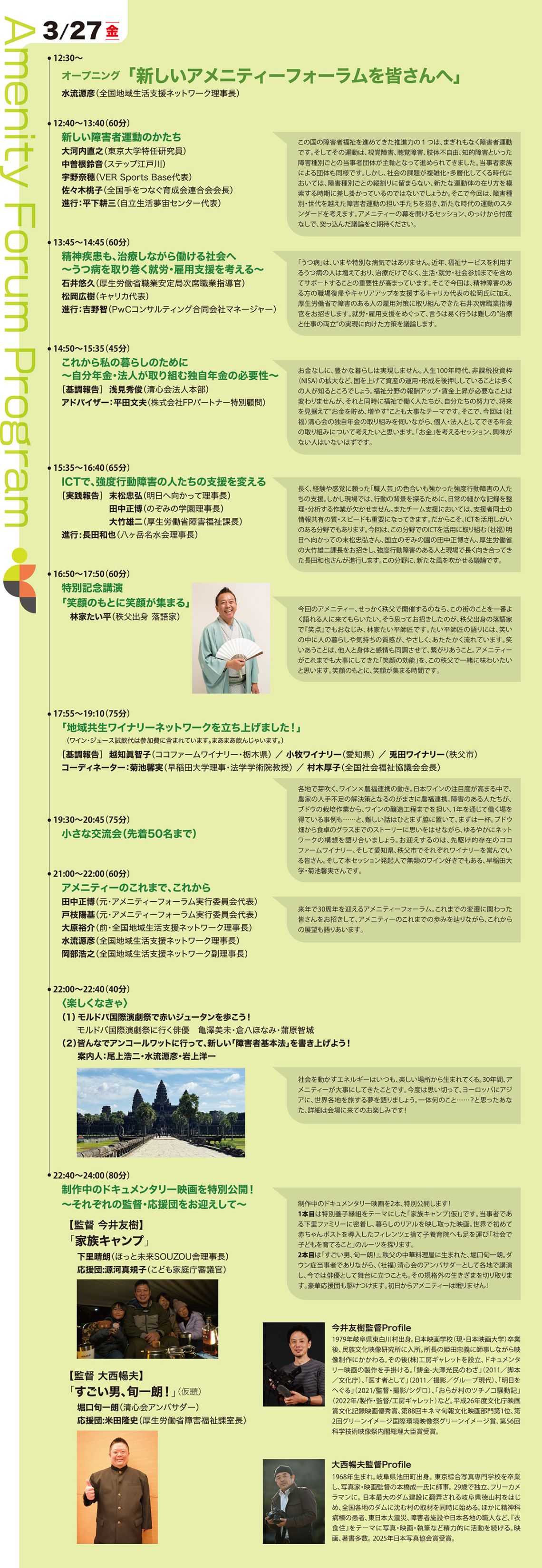 併せて、バリアフリー映画祭や日本博関連企画展示など、アメニティーフォーラムならではの文化的取り組みも実施し、議論だけにとどまらない、多層的な学びと交流の場を提供いたします。これまでのフォーラムで積み重ねてきた議論や実践が、現在の社会や制度にどのようにつながってきたのかを振り返り、次の一歩につなげる時間としたいと考えています。