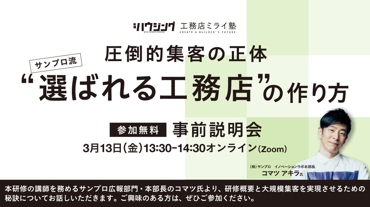 圧倒的集客の正体 サンプロ流“選ばれる工務店”の作り方_事前説明会・アーカイブ[期間限定・0519(火)まで] 主催:新建新聞社 新建ハウジング お申込みをご検討中の皆様 事前説明会のアーカイブをぜひご視聴ください!【無料】 3月13日(金)に開催された事前説明会のアーカイブを大公開! 本研修の講師を務めるサンプロ広報部門・本部長のコマツ氏より、研修概要と大規模集客を実現させるための秘訣についてお話しいただきました。少しでもご興味のある方は、ぜひご視聴ください。 <事前説明会の内容> ・講師紹介 ・講演『サンプロ流・大規模集客の秘訣』 (株)サンプロ イノベーションラボ本部長 (株)LOCAS 取締役 一般社団法人 日本人の健康をつくる 住宅断熱リフォーム推進協議会 事務局長 コマツ アキラ氏 ・事務局より諸連絡 ★お申込み方法★ (1)申込フォームに入力 (2)【申し込む】ボタンをクリック (3)お申込み後、視聴URLのご案内をさせていただきます。 ※受付締切:2026年5月19日(火)10時00分 まで ■『圧倒的集客の正体 サンプロ流“選ばれる工務店”の作り方』 2026年6月3日(水)・6月4日(木)・6月5日(金)開催! 研修の詳細はコチラから:https://www.s-housing.jp/archives/409476 【お問い合わせ】(受付時間 平日9時~16時30分) 新建新聞社 新建ハウジング TEL:026-234-2215(0120-47-4341) メール:mirai@shinkenpress.co.jp 申し込みフォーム ※同一アドレスを使っての複数回のお申込みは出来ませんのでご注意ください。 本編の受講につきまして必須 本編の受講についてお考えをお聞かせください すでに本編受講を決めている 本編受講を前向きに検討している 事前説明会のアーカイブを視聴してその後、判断したい 本編受講は今のところ考えていない 会社名必須 個人の方は「個人」と入力してください フリガナ必須 業種必須 選択してください 工務店 リフォーム業 住宅メーカー 建設業 建築設計事務所 建材・住設メーカー 商社・流通 住宅ネットワーク・コンサルティング 不動産業 その他 名前必須 ふりがな必須 部署役職 郵便番号必須 半角数字・ハイフン [ - ] を入れてください 住所必須 英数字は半角で入力してください ビル名 電話番号必須 半角数字・ハイフン [ - ] を入れてください FAX番号 半角数字・ハイフン [ - ] を入れてください 緊急連絡先 半角数字・ハイフン [ - ] を入れてください お申込みのきっかけは何ですか。必須 選択してください 紙面広告 ちらし FAX Facebook X Instagram NEWSCASTほかリリース メルマガ 新建ハウジングDIGITAL その他 その他のきっかけ 「その他」を選択された場合、ご入力ください。 メールアドレス必須 携帯アドレスでお申込みの方は send@event-form.jpとmirai@shinkenpress.co.jpからのメールを受信許可設定してください。 メールアドレス(確認用)必須 ※ご登録いただいた情報はご連絡/参加情報の把握/情報提供の目的以外には使用いたしません。 弊社主催セミナーの参加申込者は[個人情報の取り扱い]に記載されたすべての条項に同意し、それに従うことを承諾していただいたものとします。本規約に同意・承諾いただけない場合は、本セミナーのお申し込みができません。予めご理解の程よろしくお願いいたします。 [➀内部機密情報の取り扱いに関する規定]・[➁個人情報の取扱い]につきましてお申込み前にご確認ください必須 工務店ミライ塾ご参加にあたり、以下の[➀内部機密情報の取り扱いに関する規定]・[➁個人情報の取扱い]についてに同意いただく必要がございます。 ➀内部機密情報の取り扱いに関する規定 ➁個人情報の取扱い 上記内容を確認しました。 ➀と②に同意する。 定員を超過しています × 懇親会の定員を名超過しているため受付できません 定員を超過しています × 申し込み合計人数が定員から名超過しているため受付できません キャンセル待ち受付中 × 定数に達している為、「キャンセル待ち」にて申込ます。よろしいでしょうか? 内容の最終確認 × 申し込みフォーム
