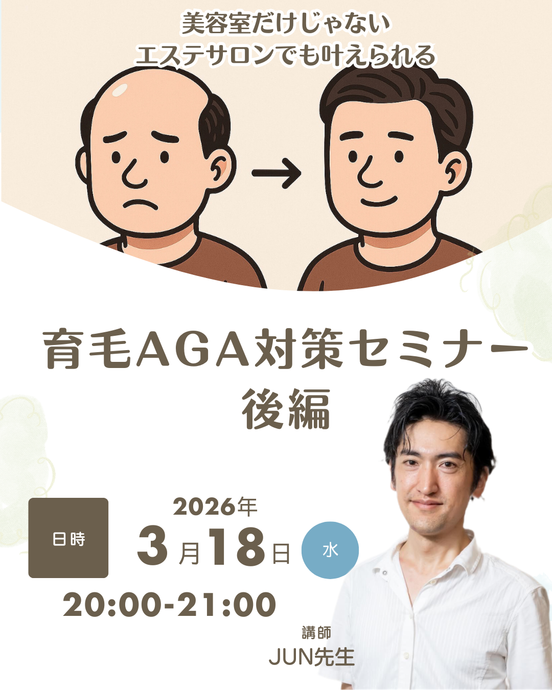 美容室だけじゃないエステサロンでも叶えられる育毛AGA対策セミナー後編 開催日時 2026/3/18(水) 20:00 〜 21:00 カレンダーに追加 Google Mac (iOS) 開催地 オンライン開催 申し込みフォーム 会社名(店舗名)必須 名前必須 ふりがな必須 電話番号 ※当日連絡のつく電話番号を入力ください メールアドレス必須 メールアドレス(確認用)必須 営業担当必須 「エステプロ・ラボ」商品は導入されていますか?必須 はい いいえ 当セミナーをどこで知りましたか?必須 メルマガ SNS(Facebook・Instagramなど) Pro Labo セミナーガイド(Webサイト) プロラボ公式LINE プロラボ担当営業からの案内 その他 定員を超過しています × 懇親会の定員を名超過しているため受付できません 定員を超過しています × 申し込み合計人数が定員から名超過しているため受付できません キャンセル待ち受付中 × 定数に達している為、「キャンセル待ち」にて申込ます。よろしいでしょうか? 内容の最終確認 × 申し込みフォーム