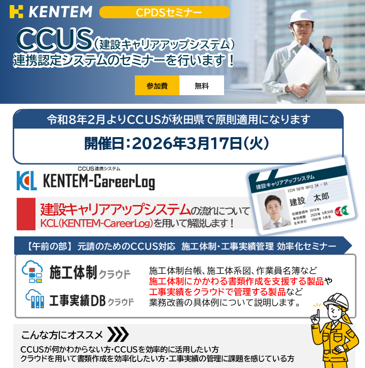 2026/03/17(火)【秋田県由利本荘市】[午前の部]元請のための CCUS対応 施工体制・工事実績管理 効率化セミナー