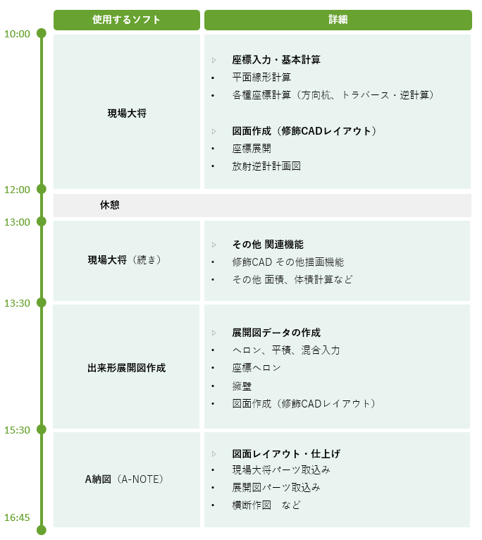 土木施工用測量計算システム「現場大将」と、展開図自動作成システム「出来形展開図作成」を使いながら学習できる講座です。