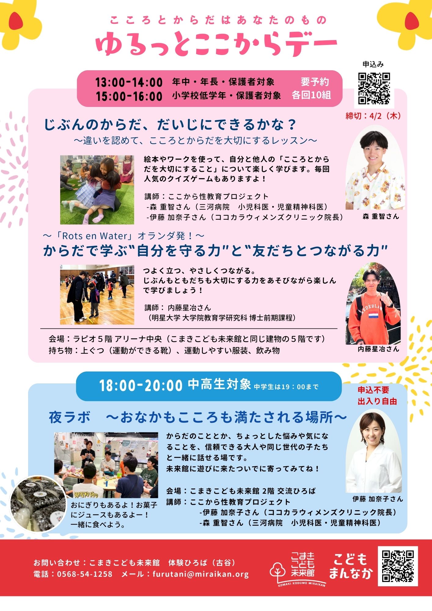 ここから性教育プロジェクト 伊藤 加奈子さん(ココカラウィメンズクリニック 院長) 森 重智さん(三河病院 小児科医・児童精神科医) こまきこども未来館 |