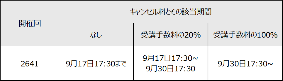 上記以外の受講取り消しに係るキャンセル料は以下のとおりです。