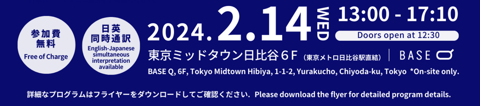 2024/2/14(水) 13:00 〜 17:10(開場12:30) 13:00 – 17:10, February 14 (Wednesday) 2024 (Doors open at 12:30) |